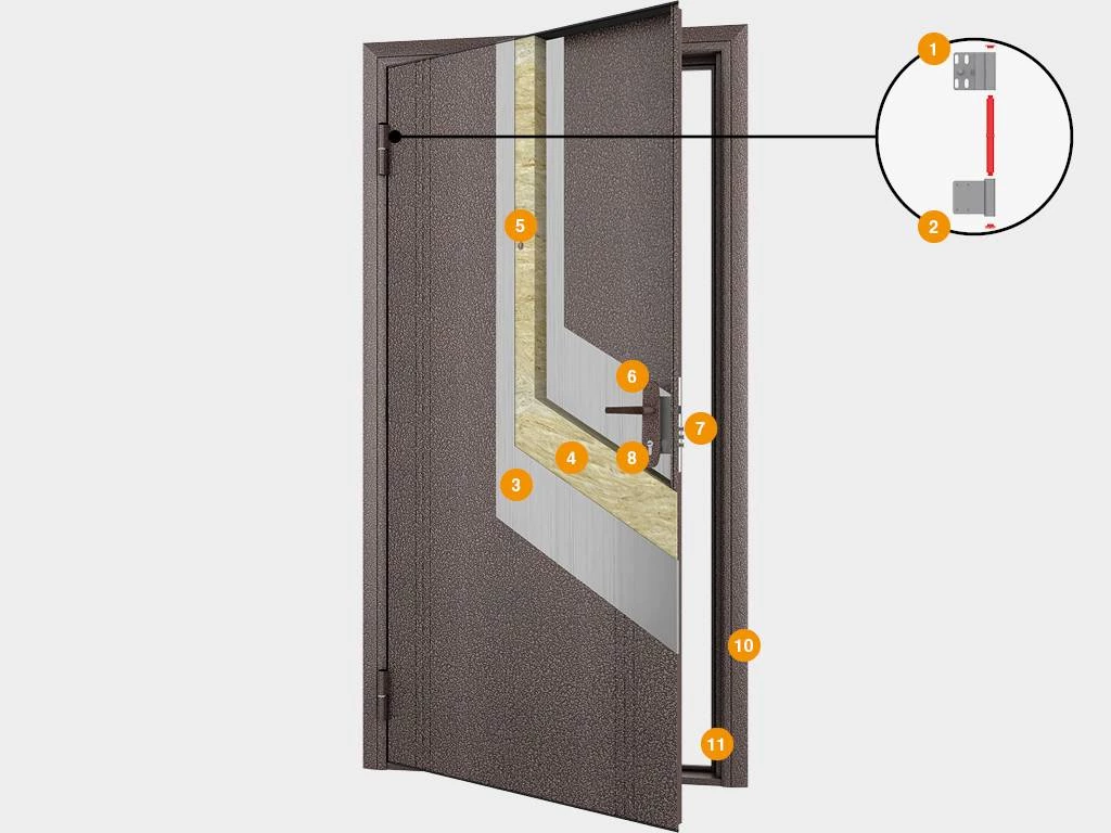 Полотно изготовлено из оцинкованной стали. Данный материал обладает высокой прочностью и не боится коррозии. Для защиты от холода и шума в конструкции предусмотрен двухконтурный ТЭП-уплотнитель. С наружной и внутренней стороны дверь имеет антивандальное порошковое покрытие цвета «антик медь» или «антик серебро», которое не царапается и долго сохраняет эстетичный внешний вид. Декорирует полотно оттиск «симметрия».